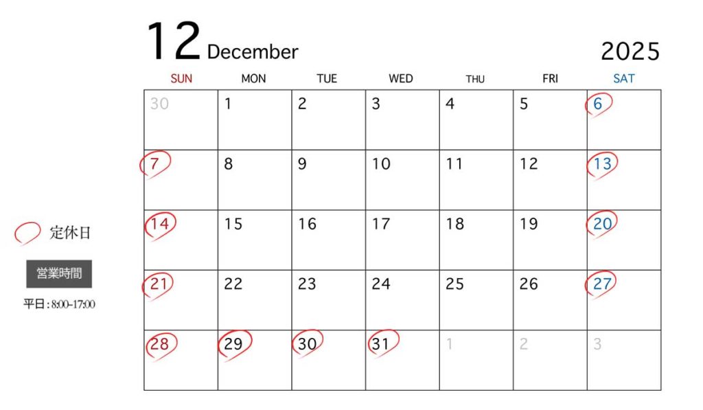 いつもお世話になります。12月カレンダーをお知らせ致します。 本社営業時間 8:...