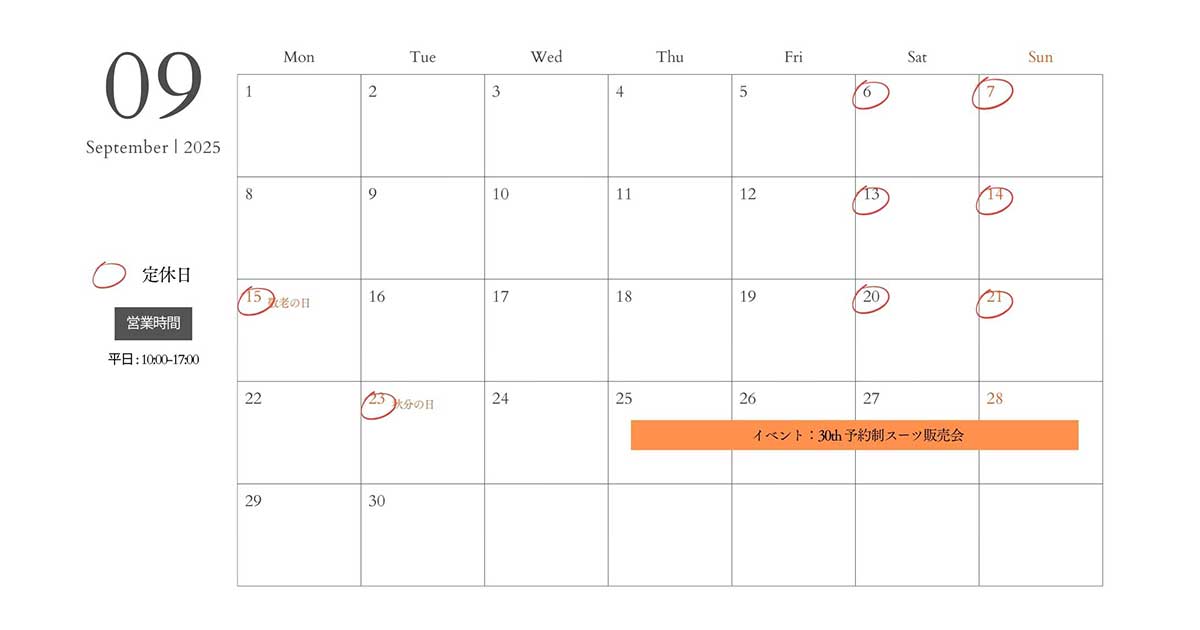 9月カレンダー 2025 8/29 お知らせ 2025年8月29日 本社営業時間 8:00~17:00店舗営業時間 9:30~18:30 25日-28日まで、予約制スーツ販売会を行っております。ご興味のある方はこちらをクリックください。※特設サイトにリンクします。 Order suit fair Order suit fair お知らせ よかったらシェアしてね! URLをコピーしました! 8月カレンダー 10月カレンダー 関連記事 藤枝市働きやすい職場環境認定 2026年2月6日 2月カレンダー 2026年2月5日 1月カレンダー 2026年1月1日 12月カレンダー 2025年11月26日 11月カレンダー 2025年10月31日 10月カレンダー 2025年9月26日 8月カレンダー 2025年7月24日 7月カレンダー 2025年6月29日